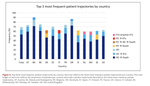 Studien visar också tydliga skillnader mellan länder, vilket inte är förvånande. Sverige, övriga nordiska länder samt Storbritannien har en högre andel patienter som startar med PD (mellan 24 och 31 procent), vilket också innebär fler behandlingsbyten över tid. I Sverige var de vanligaste behandlingsförloppen att starta i HD och avlida inom tio år (42 procent), att starta i PD och avlida inom tio år (10 procent) samt att starta i HD och bli njurtransplanterad (8 procent). (se figur)