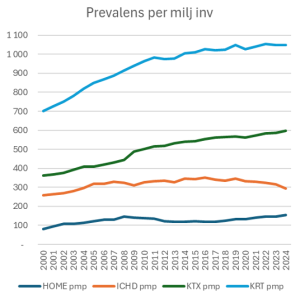 • Antalet patienter som får dialys i hemmet ökar (mörkblå linje).